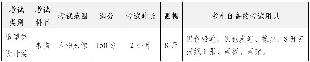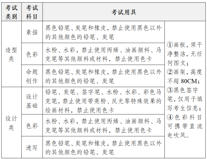 考试用具要求:①铅笔和炭笔不得使用黑色以外的其他颜色;②8开素描纸要求:180克,漂白色、细纹,尺寸27CMX39CM,不得有颜色,不得出现暗纹、边框、界格、品牌标印、折痕等标记,长宽尺寸误差不得大于1厘米;③画板、画架须干净整洁,无任何图文;④考生不得使用规定以外的考试用具。