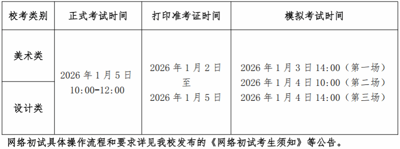 2.校考分网络初试和现场复试两个阶段,初试成绩达到合格要求的考生方可参加复试。初试成绩不计入复试,我校以复试成绩(以下称校考成绩)作为最终校考专业考试成绩和录取依据。