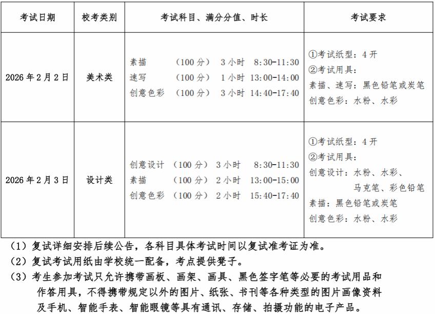 4.学校根据教育部有关规定,分别按不超过校考美术类、设计类包含专业招生计划数的4倍按类别发放校考合格证。末位考生校考成绩总分相同时,美术类依次比较考生素描、创意色彩、速写单科成绩作为排序依据;设计类依次比较考生创意设计、素描、创意色彩单科成绩作为排序依据。专业校考复试单科成绩不及格(未达60分),视为校考不合格。
