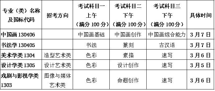 中国画基础:主要考查中国画专业基础和造型能力。中国画创作:主要考查中国画专业创作和独立思考能力。中国画综合能力:主要考查中国画专业综合素养,以书法或速写为考查重点。考生报考中国画专业时,以传统笔墨技法或素描速写技法选择其一进行考试。